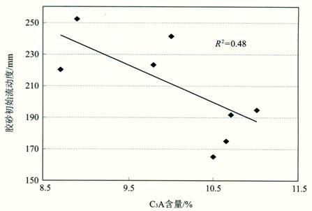 將這 3 個因素放在一起介紹是因為它們有著密切的關聯。熟料中 C 3 A 含量對水泥與減水劑相容性的影響已為大家所熟知;在工廠也實際觀測到這種影響。 A 廠為了凋整水泥色度,曾經將熟料中 C 3 A 含量由 7 . 3 %提高到 8.5 %,檢驗的凈漿流動度由 292mm 降低到 274mm 。國外某工廠為了探索在原料中摻入高鋁工業廢渣對水泥與減水劑相容性的影響進行了工業試驗,固定其它條件,逐步增加熟料中 C 3 A 含量,在不同階段取水泥樣品, C 3 A 含量 ( 按鮑格公式計算 ) 與砂漿初始流動度具有一定的相關性,見圖 7 。