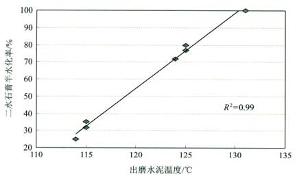 使用二水石膏,在水泥粉磨過程中控制磨內水泥的溫度 ( 實際上可以方便測量的是出磨水泥的溫度 ) ,可以控制半水石膏和硬石膏的數量。二水石膏轉化為半水石膏的程度可以用石膏的半水化率表示,是指二水石膏轉化為半水石膏的質量百分比。水泥的粉磨溫度主要與入磨熟料溫度、磨機通風量和磨機的大小有關,最有效的控制粉磨溫度的措施是在磨內噴水 ( 以噴水量的多少來控制 ) 。國外某水泥廠的試驗結果表明,二水石膏的半水化率與粉磨溫度的關系如圖 5 所示。