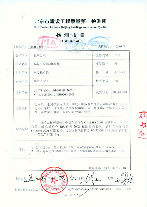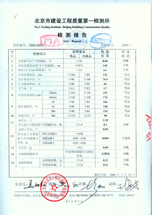 試驗表明, SP403 對兩種水泥的適應性均較好,而 JH — 2 對達強水泥的適應性較好對桐星水泥的適應性較差。對桐星水泥進行化學分析,發現水泥中摻加了一種鐵礦渣 ( 后經水泥廠證實 ) ,它對 TH — 2 產生強烈的吸附作用, TH — 2 是低鈉型萘磺酸鹽改性復合產品,是以磺酸為主導的親水官能團和以脂肪酸得來的直鏈烷基為主導的憎水基聚合而成。根據這一信息對 TH — 2 進行配方調整,調整后的 TH — 2 對桐星水泥的適應性較好,在工程的實際使用中混凝土的流動性、保水性等各項指標均滿足工程要求,混凝土 3 天平均強度已達 73 %, 28 天平均強度達到 138 %。實例說明,單憑外加劑本身我們難以評價其好壞,關鍵是要先做適應性試驗,然后在工程上應用。