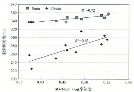 圖 8 熟料 SO 3 /Na 2 O · eq( 摩爾比 ) 與水泥砂漿流動度的關系