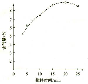 (7) 攪拌時間和方法的影響 用機械拌合,含氣量隨拌合時間延長而增大,當到一定時間后,含氣量就不再增加,圖 2 表示在室內用 50 升 攪拌機做的試驗結果,當加氣劑摻量為萬分之一時,含氣量隨拌合時間而增大,拌合到 20min 時含氣量達到最大值,而繼續攪拌,含氣量不再增加,再延長攪拌時含氣量下降。因此在使用過程,掌握混凝土的攪拌是很重要的。