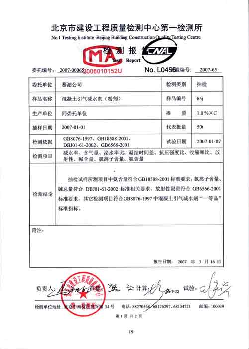 注:括號內數值為《建筑用卵石、碎石》 GB/T14685 中標準篩的尺寸。 | 5、檢驗摻引氣劑及引氣減水劑混凝土的含氣量,應在攪拌機出料口進行取樣,并應考慮混凝土在運輸和振搗過程中含氣量的損失。對含氣量有設計要求的混凝土,施工中應每間隔一定時間進行現場檢驗。 四、包裝、運輸、貯存及注意事項 用有塑料襯里的編織袋包裝,每袋凈含量25kg~40kg。搬運嚴禁用鉤;防止破袋發生。貯存注意防潮。貯存期為3年。嚴禁多摻或少摻。 五、重點工程應用實例 MNC-HAJ引氣高效減水劑在新疆庫爾勒農一師勝利水庫使用120噸。 MNC-AJ普通引氣減水劑在北京順義牛欄山奧運項目使用40噸。 引氣劑及引氣減水劑混凝土的含氣量,不宜超過表的規定;對抗凍融性要求高的混凝土,宜采用表規定的含氣量數值。
