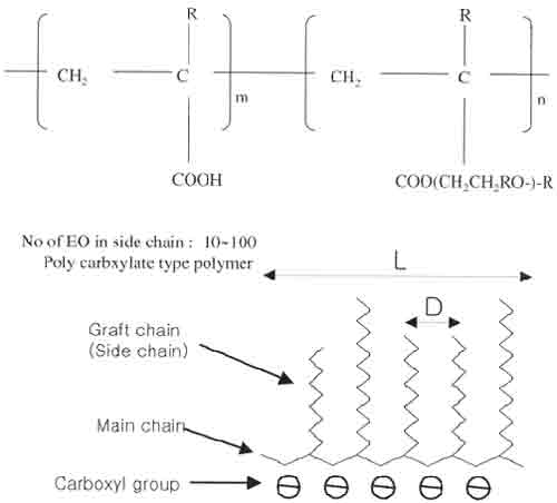 The main components of PC-P1 consists of water soluble acrylic graft copolymer with functional sulfonic group, carboxyl group and polyethyleneglycol chains.