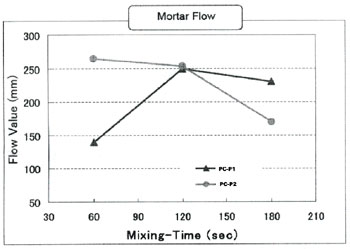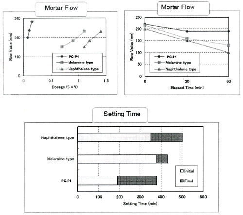 PC-P2 can maintain flowability 2-5 times as long as the conventional superplasticizers, and its setting time is shorter than other ploycarboxylic type superplasticizers.