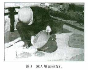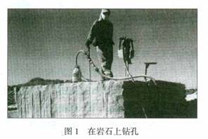 1.3.2 分切階段:用液壓千斤頂或人工撬開,或用鋼絲把大塊石料套住,用絞車拉出來,目的是使大塊體離床。然后按用戶需要規格和起吊運輸能力,將大塊料進行分割成小塊。為了使切割面平整,宜用小孔徑 (Ф 30mm ) 小孔距 (2 0 ~ 30cm ) 。步驟是:先劃切割線,按設計孔距垂直鉆孔,灌入 SCA 漿體即可,由于大塊料體積較大,應先灌兩頭,后灌中間。由于大塊料四面凌空,用 SCA 分切大塊料是很容易的,斷裂后,用人工撬杠分離,見圖 2 。