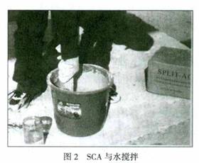 2.2 無聲破碎劑破碎機理和特點 高效無聲破碎劑是一種粉狀高效能安全破碎材料,用以安全拆除混凝土建筑和開采切割大理石、花崗巖。用水將 HSCA 調成漿體灌入巖石或混凝土鉆孔中,經 8~48 h 產生的膨脹壓可使被破碎體產生裂紋,隨著時間的順延裂紋會不斷擴大,利于鏟除作業。特別適用在不宜采用炸藥爆破的場合,進行破碎或拆除作業,使用安全,效率高,不中斷交通,不停工停產。