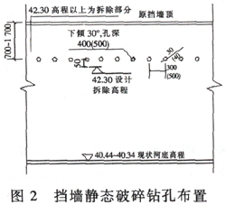 1 、拆除方案的選擇 綜合考慮工程質量、安全和環境保護的要求,確定用靜態破碎劑脹碎法結合人工機械拆除,用破碎劑脹碎法,施工過程中無爆破聲響、無飛石、無震動、無毒氣,對周圍環境無干擾,滿足工程安全和環保要求,為此進行試驗段施工,在確保施工方案可行后方可進行大面積拆除。