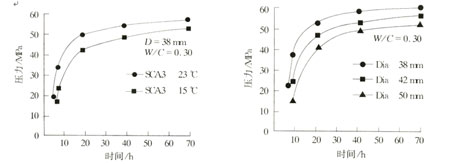 1 靜態破碎劑壓力測試與分析 膨脹壓力是衡量靜態破碎劑性能的一項重要指標。測定其膨脹壓力是靜態破碎劑研制過程中一個極其重要的手段。靜態破碎劑成分配比及制造條件,很大一部分是由其膨脹壓力來確定的。因此,在靜態破碎劑的研制過程中,我們選用液壓式測壓裝置對所研究的靜態破碎劑的膨脹壓力進行了多次測試。為了了解不同因素對靜態破碎劑的影響,采用不同條件對靜態破碎劑的膨脹壓力進行測試,為了了解所研制開發的靜態破碎劑的耐候性能,即不同環境溫度對膨脹壓力的影響,分別在不同季節進行膨脹壓力測試。