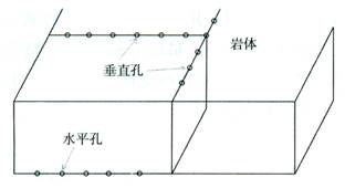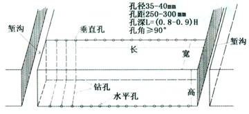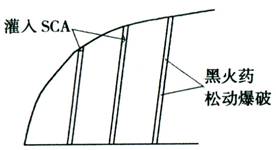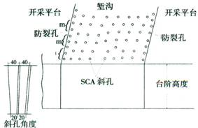 5.3 SCA 一般不宜用于采石場,因為建筑石子價格低,而 SCA 破碎效率低、成本高。但是,對于距離村莊、工廠、交通要道很近的采石場,為避免人命和房屋之損害,可用 SCA 預裂巖石,再用黑火藥松動爆破,使飛石控制在 10m 之內。具體方法是:在巖層的凌空面 1 ~ 2m 內,鉆成 4 0 × 40cm 的梅花眼,灌入 SCA ,巖石出現裂紋后,在巖石的后排眼,放入黑火藥起爆,把巖石破碎。黑火藥的布眼和用藥量,應根據爆破方量和飛石距離確定。這種用 SCA 靜態預裂和黑火藥 ( 或硝銨炸藥 ) 動態爆破的聯合方法,成本會提高,但對要求安全的采石面還是適用的,見圖 8 所示。