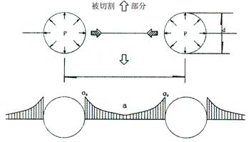 3 SCA 與黑火藥聯合開采法 此方法是用 SCA 作垂直切割,水平切割用 SCA 預裂,再用少量黑火藥把大塊料抬起離床,如圖 5 所示。水平切割面上隔孔裝入 SCA 起預裂作用, 2 ~ 3 個空孔上裝入少量黑火藥,用 SCA 堵孔,當垂直切割面裂開后,立即把導火索點燃,產生氣體膨脹 ( 響聲很小,悶響 ) ,把整個石塊抬起來,達到分離目的。