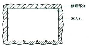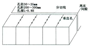 5.4 荒料整形 有些荒料開采出來后,其尺寸和外形不規整,達不到標準的要求,用人工修整工作量大。此時可用 SCA 整形,如圖 9 所示,沿切割線打孔,灌入 SCA ,為使荒料表面平整,要用小孔徑 (Ф 30mm 以下 ) ,孔距 20 ~ 25cm ,孔深 0.9H 。由于切割厚度薄,為節省 SCA 用量,采用 1: 0.38-0.45 大水灰比把 SCA 拌成稀漿灌入孔內,開裂時間雖長,但達到整形效果。