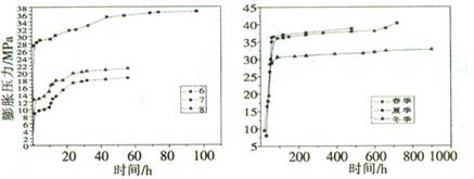 2.4 耐候性能測試 為了了解所研制的新型靜態破碎劑的耐候性能及環境溫度對靜態破碎劑膨脹壓力的影響,分別在春季、夏季和冬季對同種靜態破碎劑進行了膨脹壓力測試,把數據繪成膨脹壓力—時間關系曲線如圖 4 所示,從圖中可以看出,所研制的靜態破碎劑的耐候性較好,其膨脹壓力隨氣溫變化不大,由于測試的樣品采用的是同一批號靜態破碎劑,測試的時間有一定跨度,靜態破碎劑在存放過程中性質發生變化以及測試系統的靈敏度、準確度有可能發生改變,因此,實驗結果不是很具有說服力。根據我們的經驗及一些測試結果發現,靜態破碎劑的存放時間越長,其反應速度越快,膨脹壓力越小。從圖 4 中也有所反映,靜態破碎劑的反應速度及膨脹壓力與其存放的時間有關系,有待于做進一步的研究。如果條件允許,能夠控制室溫的話,靜態破碎劑的耐候性能將更準確,更具有說服力。