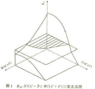 正確的混凝土配合比設(shè)計(jì)是混凝土質(zhì)量保證的前提。以往粉煤灰混凝土配合比設(shè)計(jì)都是在一個(gè)已經(jīng)確定不摻粉煤灰混凝土配合比基礎(chǔ)上,采用一定量的粉煤灰等量或超量取代水泥,這樣的配合比設(shè)計(jì)將粉煤灰和水泥等同看待,而沒(méi)有充分考慮到兩者之間的差異。大量研究資料表明:粉煤灰對(duì)不同齡期混凝土強(qiáng)度的貢獻(xiàn)同水泥是不一致的,此外,粉煤灰對(duì)混凝土強(qiáng)度的貢獻(xiàn)還同水膠比密切相關(guān) ( 一般隨著水膠比的減小,粉煤灰對(duì)不同齡期混凝土強(qiáng)度的貢獻(xiàn)隨之增加 ) 。因而采用以往的配合比設(shè)計(jì)方法對(duì)大摻量粉煤灰高性能混凝土配合比進(jìn)行設(shè)計(jì)時(shí)顯然已經(jīng)不再合適。關(guān)于大摻量粉煤灰高性能混凝土配合比的設(shè)計(jì),英國(guó) Dunstan 提出了一種新的理念,他將粉煤灰做為一種單獨(dú)的組分,將混凝土的水膠比、灰膠比 ( 粉煤灰 - 膠結(jié)料比, F/C + F) 和強(qiáng)度建立了一個(gè)三維模型 ( 見圖 1) 。這樣進(jìn)行大摻量粉煤灰高性能混凝土配合比設(shè)計(jì)時(shí)就充分考慮了粉煤灰和水泥之間的性質(zhì)差異以及水膠比對(duì)強(qiáng)度影響的差異。如圖 1 所示,等水膠比平面顯示當(dāng)水膠比不變時(shí) R 28 - F/(C+F) 的關(guān)系,即粉煤灰摻量增加時(shí),混凝土強(qiáng)度下降;等強(qiáng)度平面顯示達(dá)到相同強(qiáng)度時(shí) (W / (C+F) - F/(C+F)) 的關(guān)系 ( 圖中陰影部分所示 ) ,即增加粉煤灰摻量時(shí),要相應(yīng)降低水膠比,以保證混凝土強(qiáng)度不變。