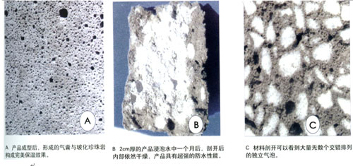該產(chǎn)品通過高分子玻化液及發(fā)泡劑發(fā)泡后形成的細(xì)微而交錯(cuò)排列的獨(dú)立氣泡群密集分布于硅酸鹽水泥空間中,同硅酸水泥結(jié)合形成永不分解的具有防水性能的高分子結(jié)晶體,對水泥砂漿進(jìn)行改性。同時(shí),改性后的水泥砂漿對膨脹珍珠巖進(jìn)行包裹,將水分子完全阻擋在高分子結(jié)晶體的外壁,從而徹底解決了膨脹珍珠巖的吸水問題。