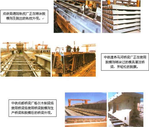 T 6 隔離劑適合于各種環(huán)境溫度的脫模。取規(guī)格為 100 × lOO ㎝的混凝土模具九套,分為三組,每組三套模具,內(nèi)壁涂上 T 6 隔離劑,注入砂漿成型,分別放置于 - 10 ℃ 、 25 ℃ 、 120 ℃ 三種養(yǎng)護環(huán)境中, 7 天拆模,觀察模具粘附情況,九套模具均沒有粘附現(xiàn)象。說明 T 6 隔離劑無論是在負溫還是在蒸氣養(yǎng)護條件下,均具有良好的隔離效果。