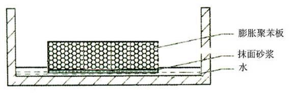 (1) 參照 JC/T933 — 2006 《外墻外保溫用膨脹聚苯乙烯抹面膠漿》,按照?qǐng)D 1 方法取上述試件四周用防水材料密封處理,以保證在試驗(yàn)過(guò)程中只有抹面砂漿吸水。用天平稱(chēng)量制備好的試件質(zhì)量 m 0 ,然后將試件在 23 ℃ ± 2 ℃ 水中浸泡 24h ,浸入水中的深度為 2~ 10mm , 24h 后取出用濕毛巾迅速擦去試件表面水分,稱(chēng)其質(zhì)量 m 1 。吸水量按照下式計(jì)算: