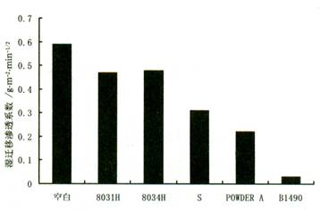 通過(guò)摻入不同的憎水劑,觀察 2min 和 1.5h 砂漿的表面水珠效果。可以看出 1.5h 后,摻 8034H 砂漿表面水珠效果最好, B1490 其次。按照 1 . 3 . 1 方法 2 ,測(cè)定了抹面砂漿的吸水量,計(jì)算濕遷移滲透系數(shù),結(jié)果如圖 3 。可以發(fā)現(xiàn),摻入不同憎水劑的抹面砂漿, B1490 濕遷移滲透系數(shù)最小,增水效果最好。
