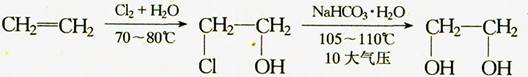 工業上生產乙二醇,主要由乙烯合成,乙烯在銀催化劑的作用下,首先制取環氧乙烷,燃后再水解為乙二醇。乙烯與氯水加成法也是其方法之一。