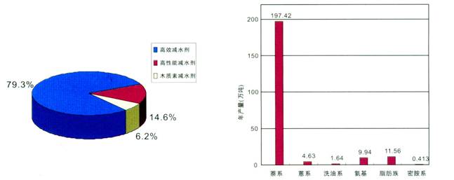 近兩年來,高性能減水劑發展迅猛,以聚羧酸鹽類為主要成分的高性能減水劑具有一定的引氣性,較高效減水率和良好的坍落度保持性能,是環保型的外加劑,近兩年得到了大量推廣應用。 2007 年國內年產量已達 41.43 萬噸,其發展速度是非常快的。許多廠家生產能力都比較大,但尚處于以銷定產的狀態。