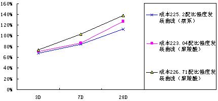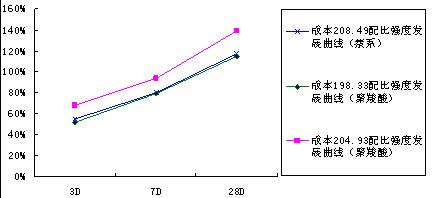 在圖3-C30中,應用聚羧酸成本為223.04的配比各齡期強度均比萘系配比要高,尤其28D的強度要高出14%,初始塌落度增大了10mm,水泥用量則減少42Kg,而成本與萘系相比減少了2.16元;成本為226.71的配比,其成本比萘系配比高1.51元,初始塌落度增大了25mm,而強度方面7D高出19%,28D則高達25%。