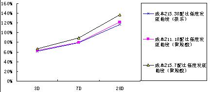 以下各圖中,X軸代表3D、7D、28D齡期,Y軸則表示各齡期抗壓強度達到設計強度的百分比。