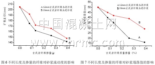 將表4、表5 的流動性試驗結果與纖維摻量關系作圖6 與圖7,12mm( lf)和18mm( lf )玄武巖纖維水泥砂漿的流動性都隨纖維摻量的增多而降低。