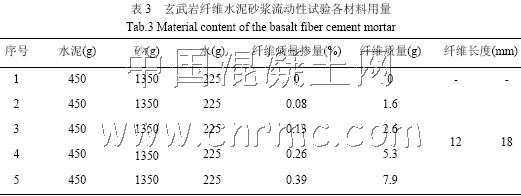 采用水泥膠砂質量配合比:水泥:標準砂:水=450:1350:225=1:3:0.50,短切玄武巖纖維摻量見表3: