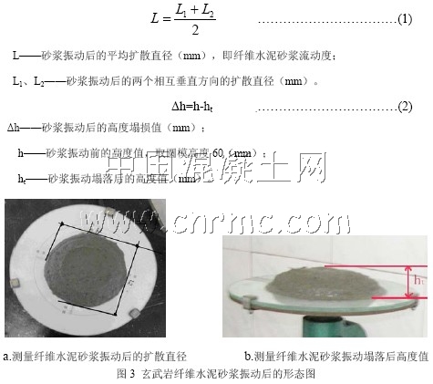 近年來,短切纖維常用于砂漿及混凝土中增韌阻裂,改善其耐久性。但纖維的應用,給砂漿及混凝土的混合攪拌均勻帶來困難,而柔性纖維更易成團積聚,致使其施工工作性能下降。對于纖維水泥砂漿流動性的評價,尚無專用實驗方法,若采用現(xiàn)行的水泥砂漿流動性實驗方法,由于在實驗過程中進行砂漿的插搗及因試錐重量相對纖維重量過大,會破壞纖維的自由分布,試驗的結果不能客觀體現(xiàn)與表征纖維阻力作用。我們借鑒水泥膠砂流動度試驗方法,進行纖維水泥砂漿的流動性實驗,以纖維水泥砂漿拌合物在規(guī)定振動狀態(tài)下的擴散直徑和高度塌損值等試驗結果,研究短切玄武巖纖維的長度及摻量等參數(shù)對水泥砂漿流動性的影響。
