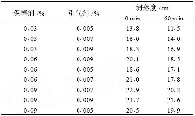 試驗結(jié)果(見表3)表明,聚羧酸類引氣劑具有較好的塑化、保塑作用,例如:當(dāng)引氣劑用量為