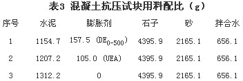 試驗(yàn)選用DE0-500、UEA做混凝土抗壓強(qiáng)度試驗(yàn)。每配制三塊C30混凝土試塊所需原料量見表3。