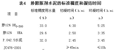用無錫市中科建材儀器有限公司產(chǎn)的水泥標(biāo)準(zhǔn)稠度凝結(jié)測(cè)定儀,按照標(biāo)準(zhǔn)GB/T 1346-2001采用標(biāo)準(zhǔn)法作摻膨脹劑DE0-50012%、摻中巖公司產(chǎn)UEA12%和未摻膨脹劑的P.O.42.5普通硅酸鹽水泥的水泥標(biāo)準(zhǔn)稠度用水量和凝結(jié)時(shí)間的測(cè)定試驗(yàn),試驗(yàn)結(jié)果見表4。