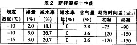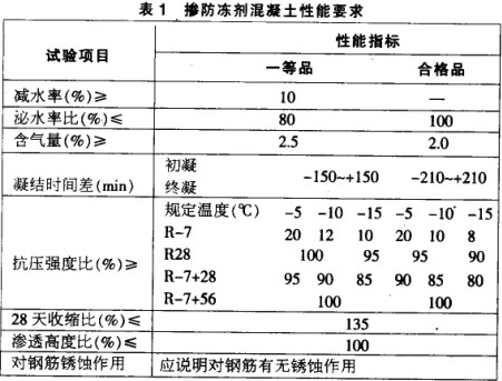 分別明確該防凍劑在不同試驗(yàn)溫度(-10℃、-15℃)、不同摻量(2.0%、3.0%)的情況下對混凝土抗凍性能的影響情況。混凝土性能試驗(yàn)參照J(rèn)C475-2004這一標(biāo)準(zhǔn)分別測定新拌混凝土及硬化混凝土的各種性能。各種性能要求見表1。