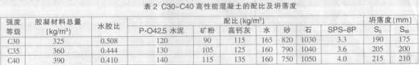 鑒于目前上海市在普通商品混凝土中均采用了粉煤灰和礦粉的雙摻技術(shù),且已超過(guò)了膠凝材料總量的40%,故聚羧酸高效減水劑在普通混凝土中的應(yīng)用,其雙摻總量必須保持在50%以上。同時(shí)還應(yīng)在兼顧混凝土和易性及強(qiáng)度穩(wěn)定性的前提下,配制成本應(yīng)有一定幅度的下降。依據(jù)用水量最小化和水泥減量化的高性能混凝土設(shè)計(jì)原理,C30~C40高性能混凝土的配比和坍落度性指標(biāo)列于表2。