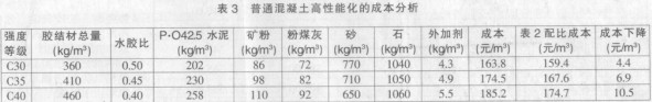 以目前常規(guī)的雙摻粉煤灰礦粉混凝土為基準(zhǔn),其中減水率13%左右的泵送劑摻量為1.2%,粉煤灰內(nèi)摻20%,礦粉按30%的水泥取代率,結(jié)合表2的配比,得出C30~C40混凝土高性能化后的成本同比下降4.4元/m3~10.5元/m3(見(jiàn)表3),并且經(jīng)濟(jì)效益明顯。此外,環(huán)保型的聚羧酸高效減水劑的使用,使外加劑占混凝土配比成本的比例由5%~6%上升至12%~14%,但卻吸納了占膠凝材料總量64%的粉煤灰、礦粉等工業(yè)廢棄物,減少40%~46%的水泥用量,社會(huì)效益和環(huán)保價(jià)值顯著。