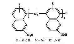 萘系、蒽系(聚次甲基蒽磺酸鹽)、甲基萘系(聚次甲基甲基萘磺酸鹽)、古馬隆系(聚氧茚樹脂磺酸鹽)等都屬于這一類,其結構特點是憎水性的主鏈為亞甲基連接的雙環或多環的芳烴,親水性的官能團則是連在芳環上的-SO3M等。ß-萘磺酸鹽甲醛縮合物即萘系減水劑的結構如圖1所示。