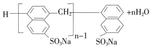 本研究選用的是鄭州市場供應量最大的普通萘系減水劑,萘橫酸甲醛縮合物,簡稱FDN。它的生產主要是以工業萘為原料,經濃硫酸磺化,然后以甲醛為縮化劑將 橫化單體縮合為一定聚合度的大分子,再進行水解多次重復縮合,再加入NaOH將生成的萘磺酸甲醛縮合物轉化為鈉鹽,同時中和掉多余的硫酸。其成品的分子式為: