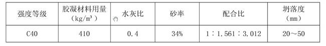 混凝土強度等級設(shè)計選用C40,坍落度30~50mm,其配合比見表1。