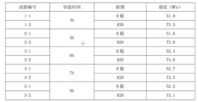 實驗結(jié)果表明早期的脫模強度隨著恒溫時間的增長而增強,但當(dāng)恒溫時間超過7h以后,強度增長的速度就慢下來了。而且當(dāng)恒溫時間超過7h以后,28d強度略 有下降的趨勢。考慮到管模周轉(zhuǎn)周期、企業(yè)經(jīng)濟效益及28d強度損失情況等方面因素,采用恒溫溫度90℃、恒溫時間4h的蒸汽養(yǎng)護制度較為合理。