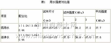 對(duì)水質(zhì)有懷疑時(shí),可將該水與潔凈水分別制成混凝土試件,進(jìn)行強(qiáng)度對(duì)比試驗(yàn),如該水制成的試件強(qiáng)度不低于潔凈水制成的試件強(qiáng)度,則該水為可用水,由強(qiáng)度對(duì)比實(shí)驗(yàn)可知,現(xiàn)場(chǎng)用水不會(huì)引起混凝土質(zhì)量問(wèn)題。所做試驗(yàn)結(jié)果見(jiàn)表1 。