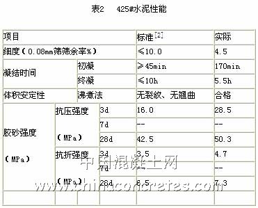 在混凝土中,水泥與水形成水泥漿,包裹在砂粒表面并填充砂粒間的空隙而形成砂漿,水泥砂漿又包裹石子并填充空隙而形成混凝土。水泥是混凝土中的膠凝材料,它的性能直接影響混凝土的強(qiáng)度和耐久性,該混凝土采用青海水泥廠生產(chǎn)的425#普通硅酸鹽水泥,由實(shí)驗(yàn)結(jié)果可知,該水泥合格,滿足規(guī)范要求,因此不會(huì)引起混凝土質(zhì)量問(wèn)題,結(jié)果見(jiàn)表2 。