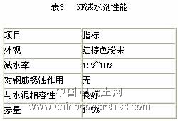 該工程所用NF減水劑為淮南礦務(wù)局合成材料廠的產(chǎn)品,生產(chǎn)許可證、質(zhì)量合格證齊全。并且該減水劑經(jīng)長(zhǎng)期工程實(shí)踐證明,質(zhì)量保證,性能穩(wěn)定,是一種良好的外加劑,不會(huì)引起混凝土質(zhì)量問(wèn)題。經(jīng)檢測(cè)質(zhì)量符合要求,結(jié)果見(jiàn)表3 。