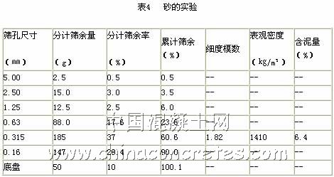 由檢測(cè)結(jié)果可知,該細(xì)砂的含泥量超標(biāo),根據(jù)規(guī)范(JGJ52-92)規(guī)定,普通混凝土用砂中有害雜質(zhì)含量的含泥量小于等于3.0%,但該砂的含泥量已達(dá)6.4%,嚴(yán)重超標(biāo),不符合標(biāo)準(zhǔn)[4]。該工程所用砂經(jīng)檢測(cè),其性能如表4 。