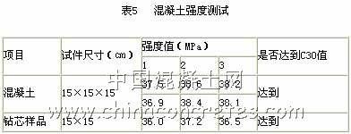 經(jīng)以上處理,順利完成施工,并對(duì)試件進(jìn)行檢測(cè),同時(shí)為確保工程質(zhì)量的合格論證,并對(duì)混凝土采用了鉆芯取樣,達(dá)到了設(shè)計(jì)強(qiáng)度要求。檢測(cè)結(jié)果如表5 。