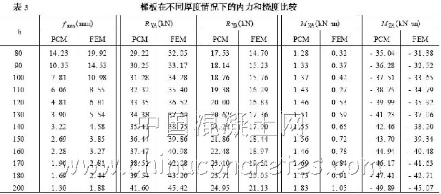 由式(1) ~式(6) ,可知不同梯板厚度的內力和變形(見表2) 。