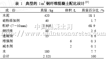 早期的鋼纖維混凝土配比設計[ 9 ]見表1。表1中的配比可以用來作為初始試驗值,要想得到最好效果的配比需要咨詢專家,并進行正交試驗設計。
