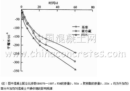 新型高效減水劑如聚羧酸的γ值有較多下降,其混凝土收縮也有所下降,見表2和圖。