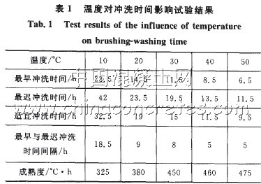 筆者分別對(duì)可能影響沖洗時(shí)間的各種因素,如水泥的標(biāo)號(hào)、水灰比、養(yǎng)生溫度等進(jìn)行了試驗(yàn)分析,其中,最為突出的影響因素是溫度。表1是關(guān)于溫度影響的試驗(yàn)結(jié)果,部分結(jié)果見圖1。