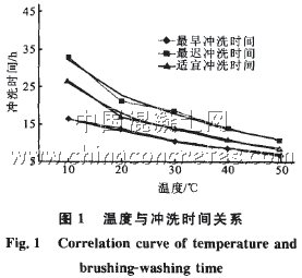 由圖1中看出:溫度越高,沖洗時(shí)間越短,最遲沖洗時(shí)間與最早沖洗時(shí)間有較大的時(shí)間間隔,這種間隔時(shí)間將有利于掌握合適的沖洗露石時(shí)刻。