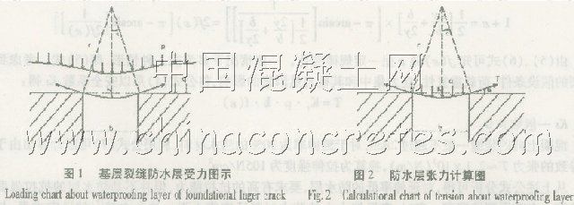 混凝土內(nèi)的裂縫一般不超過2mm,對于延伸率為30%的防水材料,利用公式(7)可以計算出由于裂縫而導(dǎo)致的張力T`≈2.1×103(N/m),換算為拉伸強度為105N/cm2。