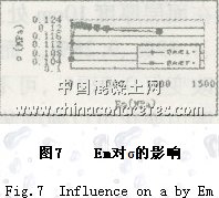 分析計算結(jié)果圖6可知,防水層厚度(hm)由1mm增加到4mm,法向拉應(yīng)力σ上增加了1.7%,法向拉應(yīng)力σ下增加了1.9%,影響甚微。由于一般防水層厚度不大于4mm,故不考慮防水層厚度變化對層間拉應(yīng)力的影響。根據(jù)拉應(yīng)力與防水層模量(Em)的變化規(guī)律,可根據(jù)Em將圖7中的曲線劃分為三個區(qū)段,即10~50MPa、50~300MPa、 300~1500MPa。當Em從10MPa增加到50MPa時,曲線變化速率最大,法向拉應(yīng)力σ上增加了7.89%,法向拉應(yīng)力σ下增加了16.15%;當Em從50MPa增加到300MPa時,σ上最大變化了1.71%,σ下最大變化了2.88%,影響較大;當Em在300~1500MPa區(qū)間時曲線變得更加平穩(wěn),影響基本穩(wěn)定。因此,須考慮防水層模量變化對層間拉應(yīng)力的影響。